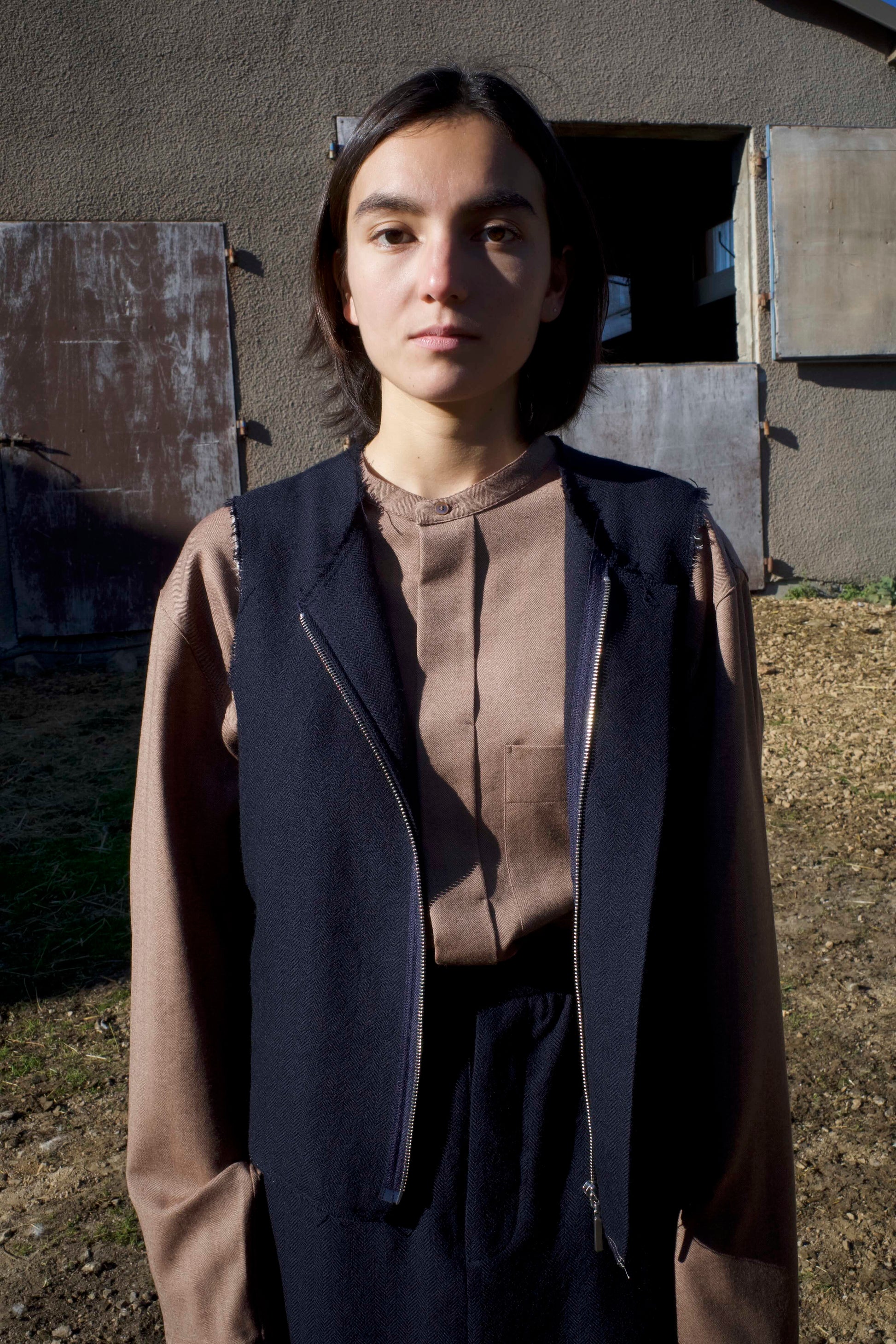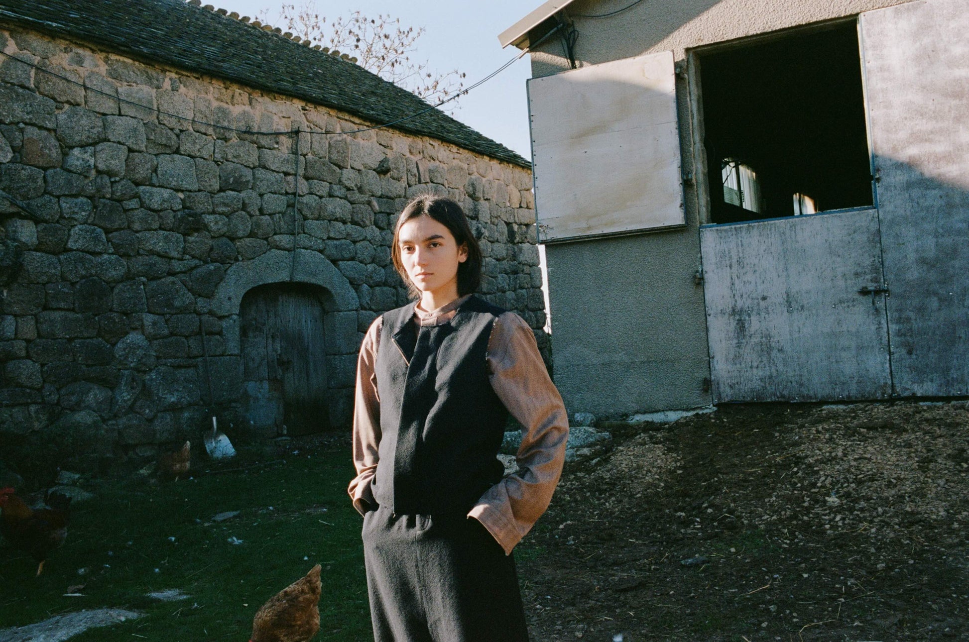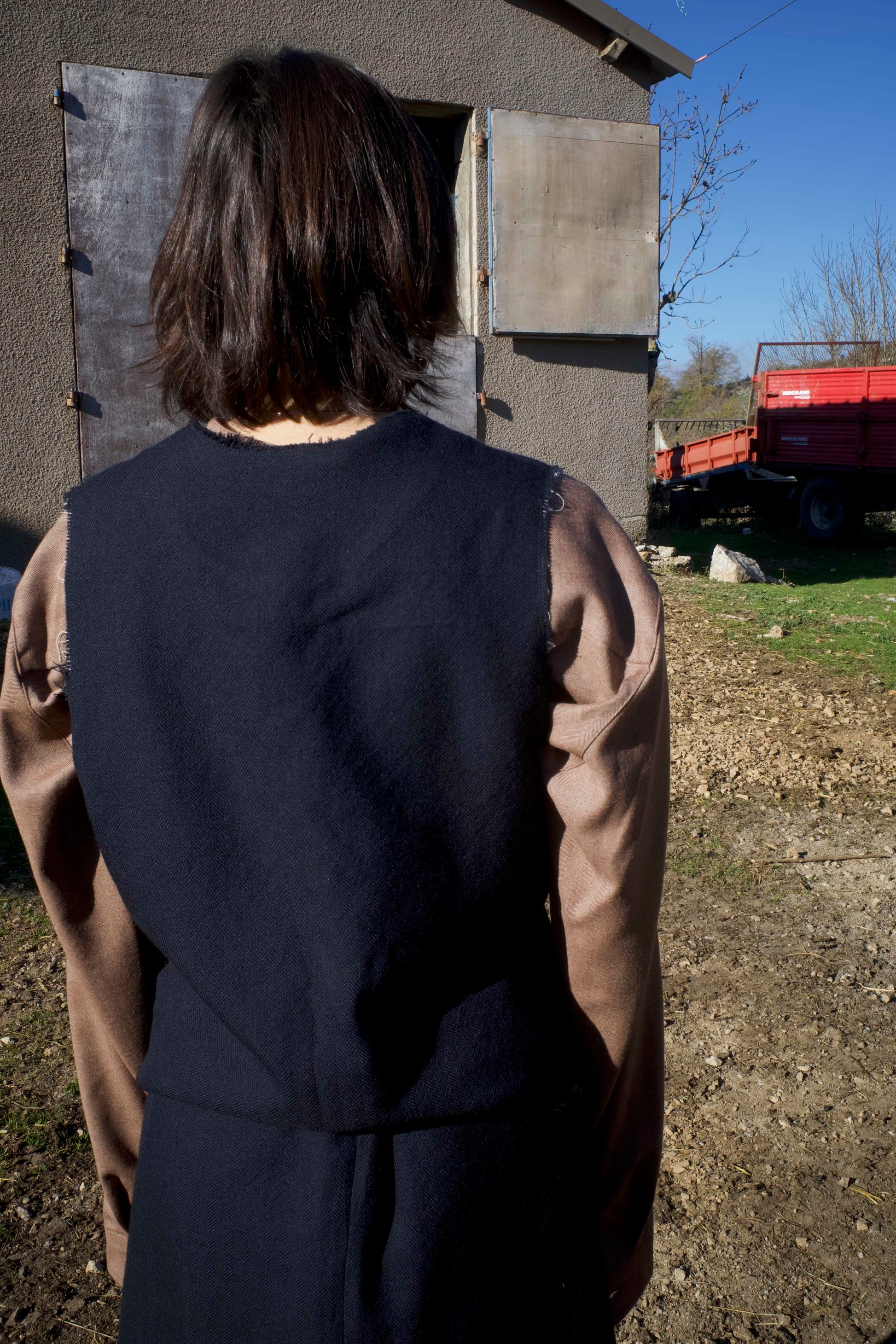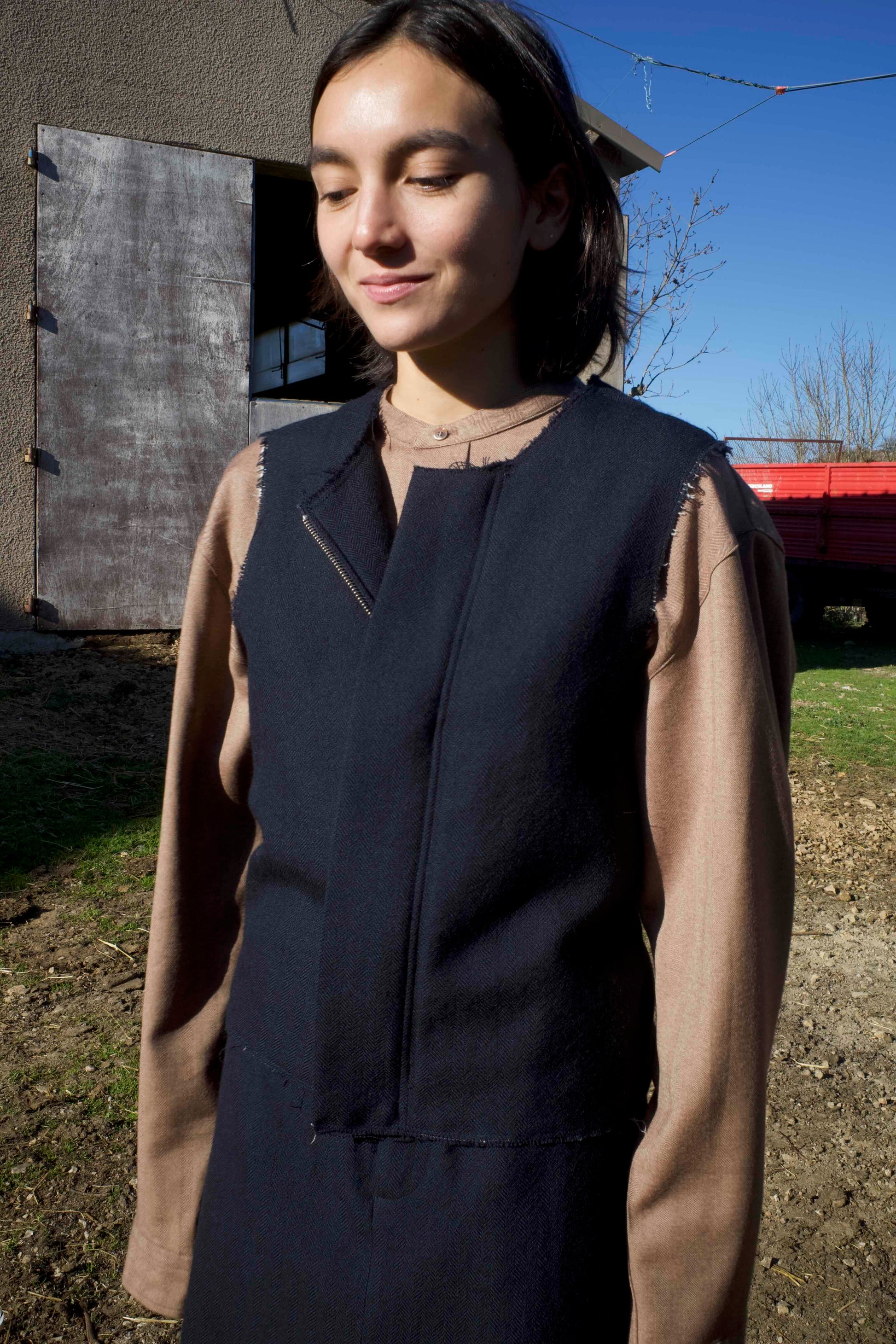 20世紀初めのヨーロッパのベストをイメージしたアイテム。ビンテージ感を出すためにオリジナルで作った粗いヘリンボーン生地を使用しています。あえて粗めの原料を選んで、20世紀初めのようなヘリンボーン生地を作りました。最後に軽く抑え、ビンテージの梳毛生地のような雰囲気になる仕上げをしています。seya. が開発したオリジナルファブリックです。