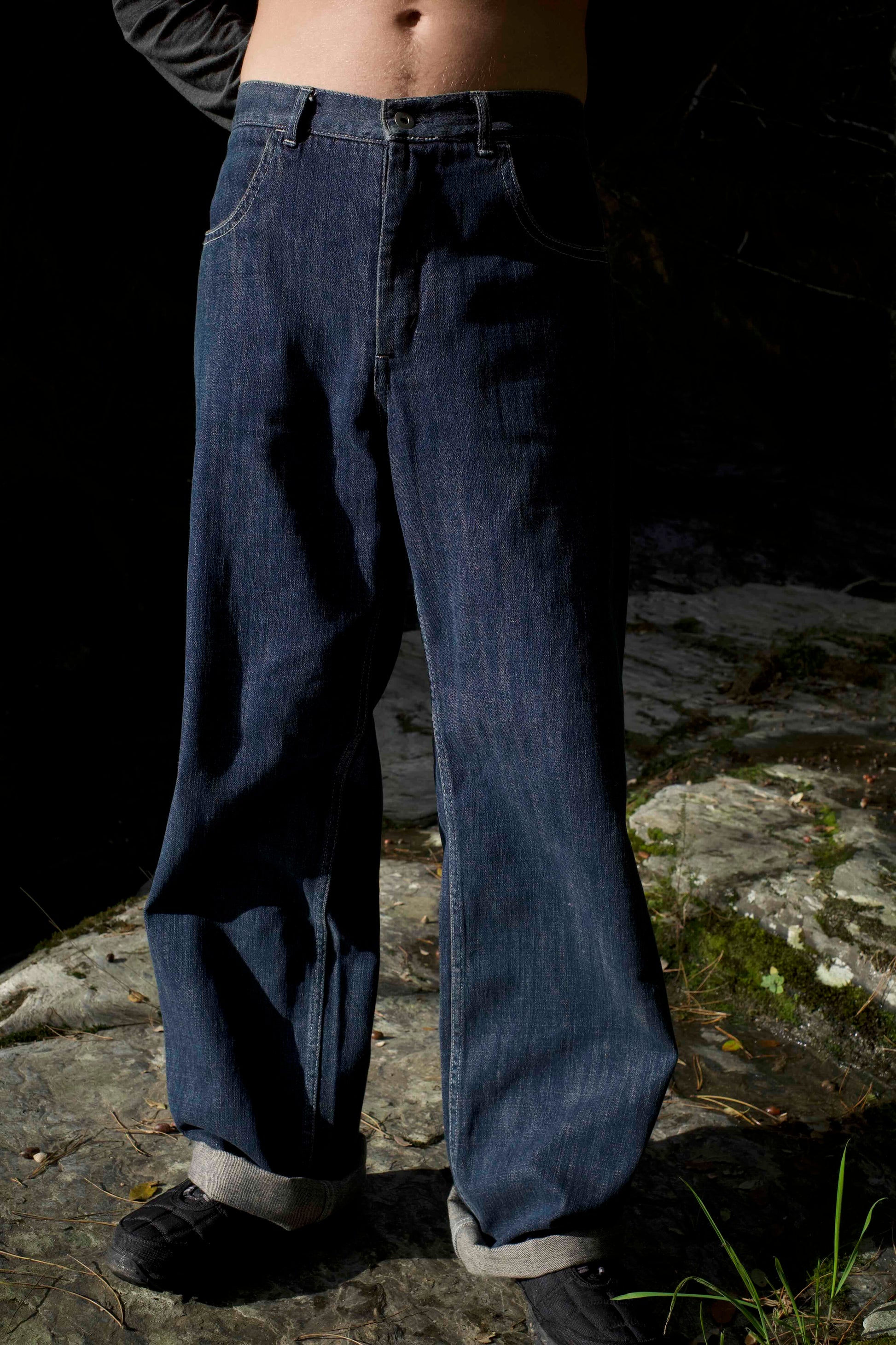 A sibling version of the TOFU JEANS, inspired by menswear. The side no-seams are retained, but pockets, belts, and belt loops are added.