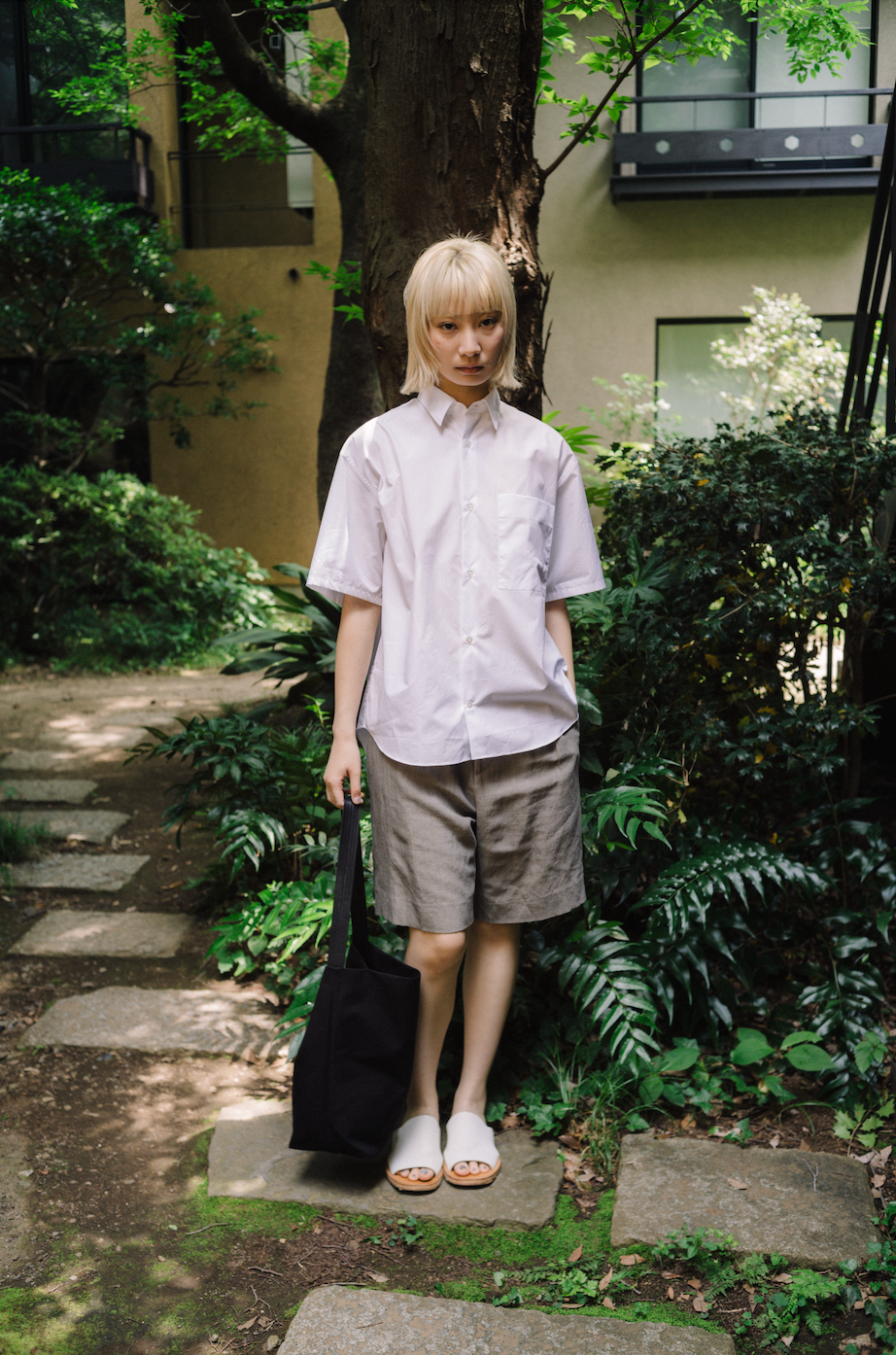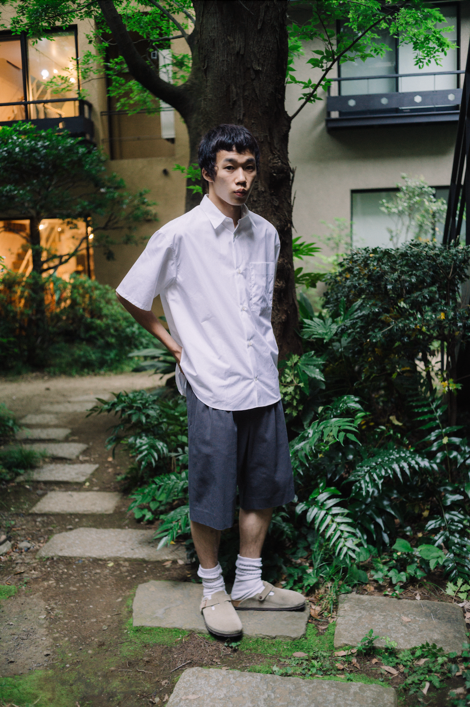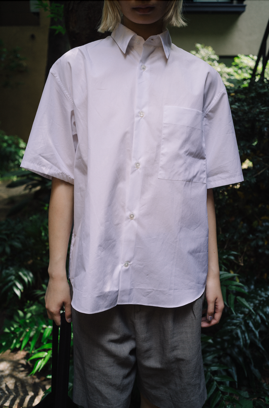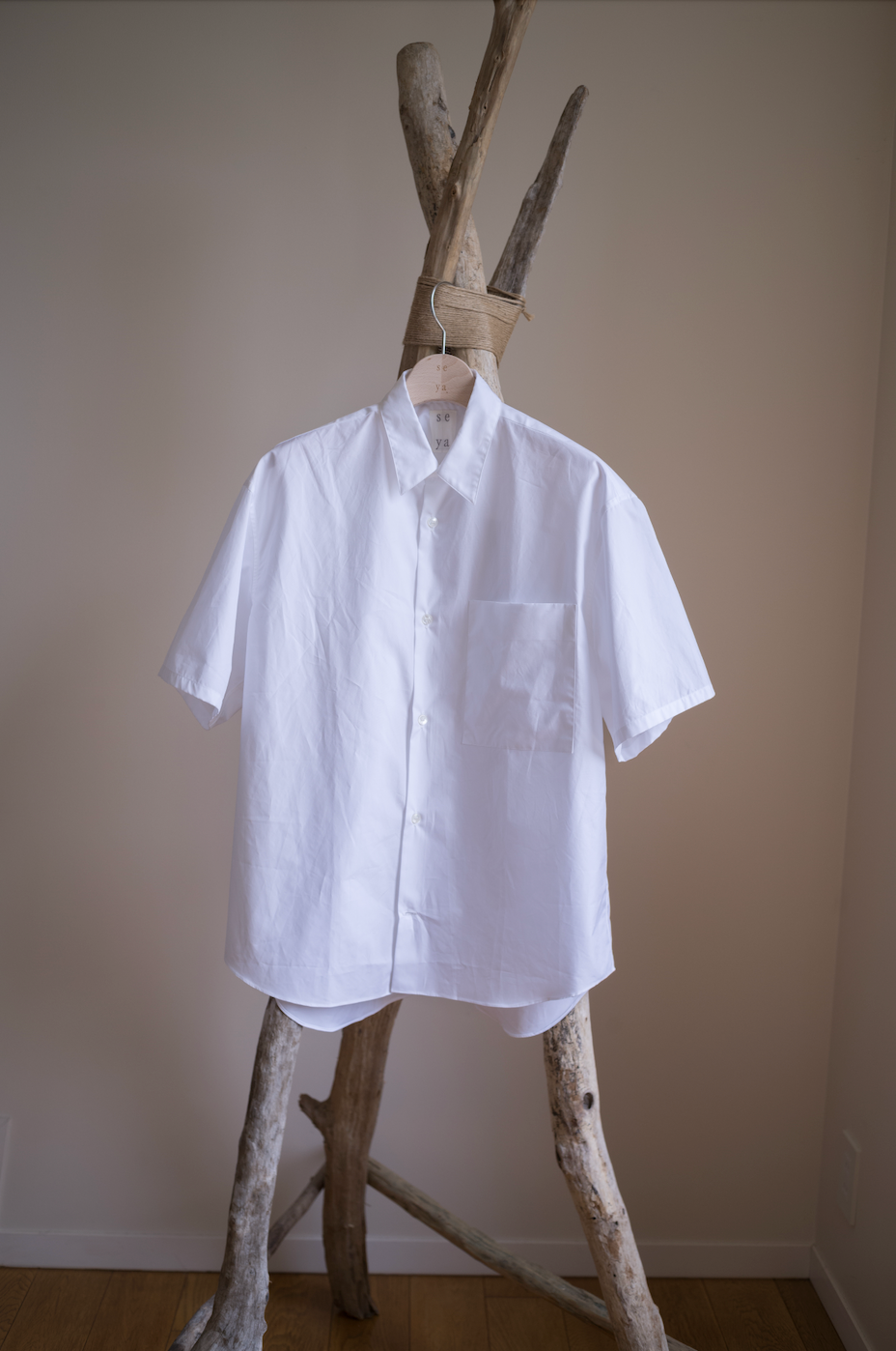 A timeless half-sleeve shirt with sharp topstitching and slightly wid sleeves.Finished with mother-of-pearl buttons, it is made from 100% cotton—neither too soft nor too stiff—with a subtle micro-brushed texture.