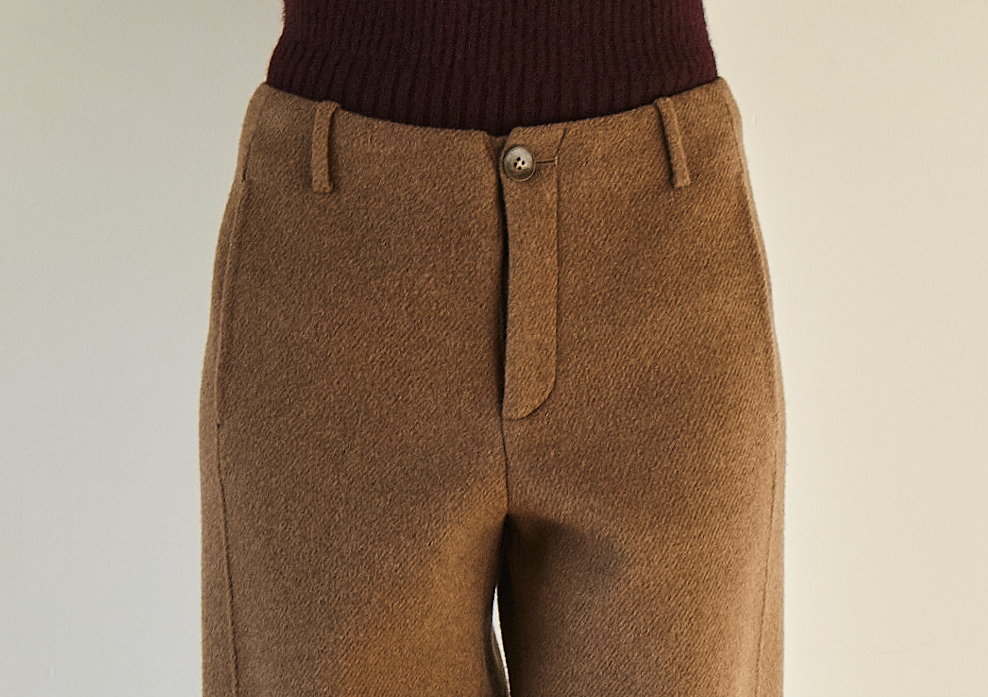 ダブルフェイス仕様のシリーズの定番のパンツ。ヤクの一番柔らかい首の周りの毛のみを使った生地を贅沢にダブルフェイス仕様にしています。更に仕上げに一昼夜水の浸して、起毛。これを3−4回繰りかえす加工をして、穏やかな艶と起毛感を出しています。とても温かく軽い、雨や雪にも強い生地です。サイドにパネルを施したパターンで立体的にして腰回りが細く見えるようにしています。サイドのシームにポケット。ホーンフロントボタン。ルーズフィット。